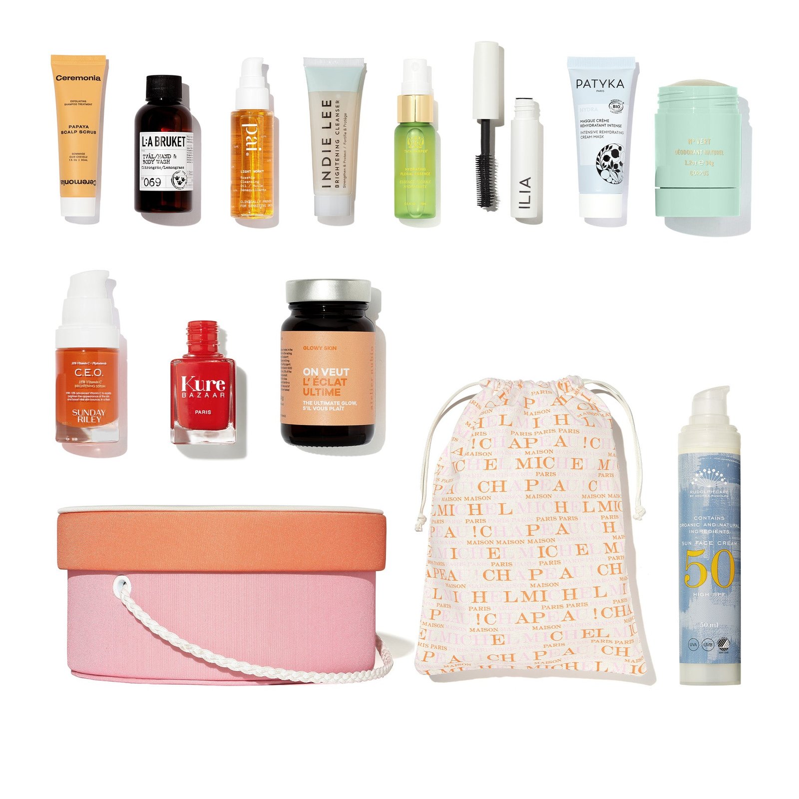 A 2-in-1 kit: a mini vanity hat box and a logoed drawstring pouch in vibrant colours to slip into your bag or suitcase. It gathers all the clean beauty essentials for summer to take everywhere while travelling (including 3 full-size products).
